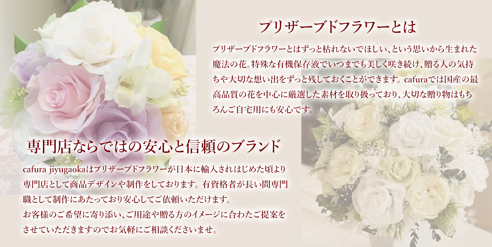 株式会社カフラは、プリザーブドフラワー専門店として、 大切な記念日に長く寄り添うギフトをお届けしています。