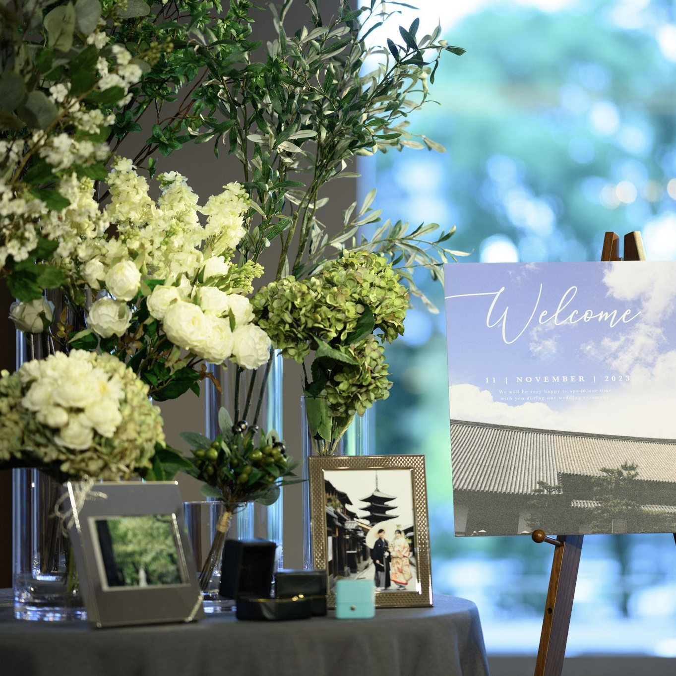 | ウェルカムスペースを彩る、特別なおもてなし ゲストをお迎えするウェルカムスペースはおふたりの想いを映し出す大切な場所。 おふたりのテーマや会場の雰囲気に合わせた上品で心温まるコーディネートをご提案し、特別な空間を演出いたします。 ゲストの皆さまにとって忘れられない一日となりますよう、心を込めてお手伝いさせていただきます。 |