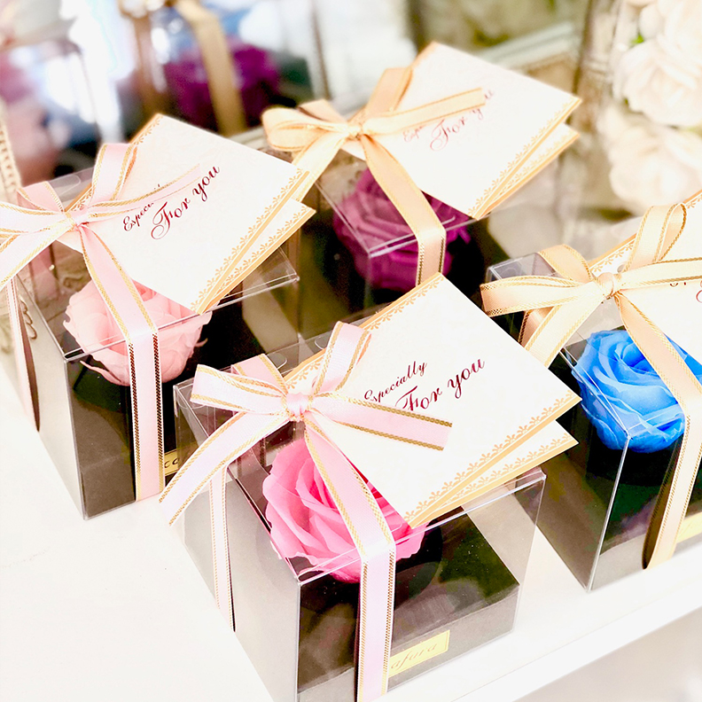 | 特別な一日を彩る薔薇に、ありがとうの感謝を込めて 大切なゲストへの感謝の気持ちを、優雅な花々に託して贈りませんか。 厳選された素材を使用したプリザーブドフラワーのプチギフトは席札や感謝の一言を伝える花として多くの花嫁様に選ばれています。 ゲストの心に残る特別な贈り物もぜひご相談ください。 |